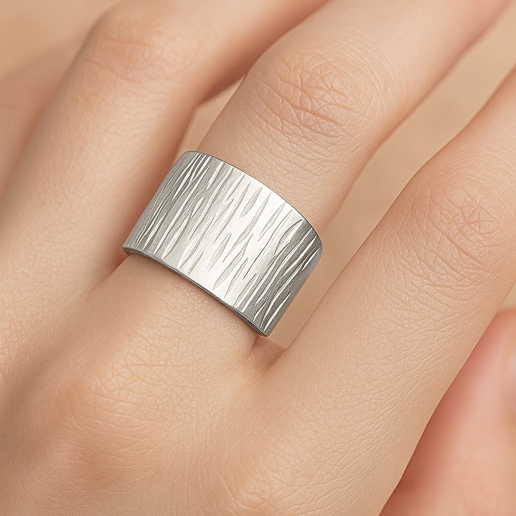 Un diseño de espíritu libre que destaca por sus grabados de líneas disparejas, creando una textura única y moderna. Su acabado plateado y ajuste adaptable lo hacen perfecto para llevar todos los días sin perder estilo.