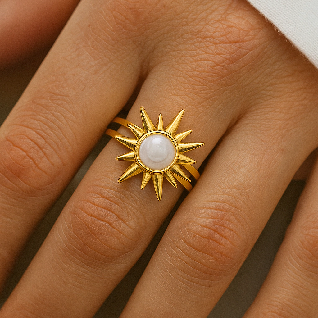 Un anillo que captura la energía del sol: un disco central de nácar enmarcado por un aro dorado finamente trabajado, pensado para irradiar calidez y sofisticación en cada destello.