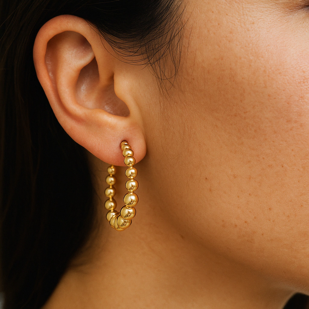 Argollas llenas de diminutas bolitas que crean una textura llamativa y elegante, perfectas para darle un giro moderno a cualquier outfit sin perder sutileza.