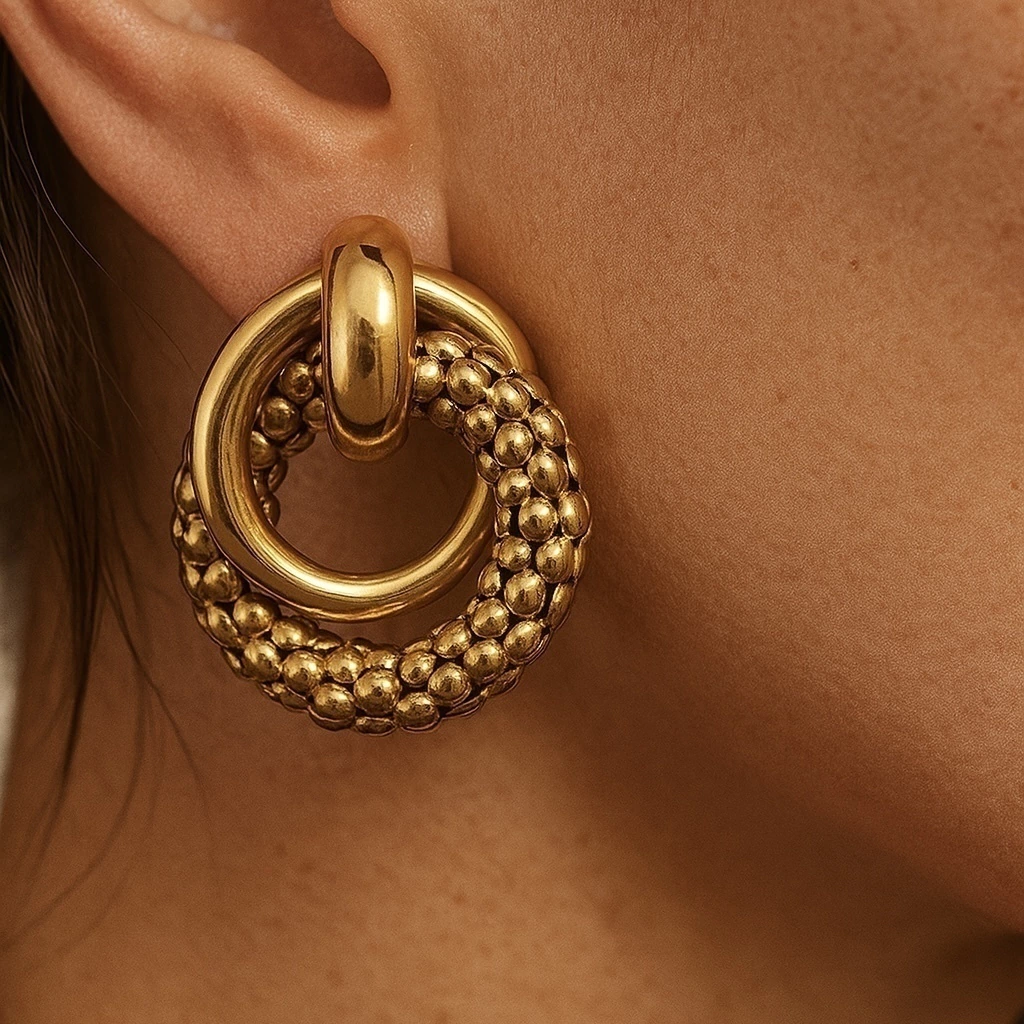Con un diseño audaz y elegante, los Aretes Gardenia destacan por su forma circular texturizada que se entrelaza con un aro liso, creando un contraste sofisticado. Chapados en oro de 18k, son la elección perfecta para quienes buscan una pieza llamativa que eleve cualquier look.