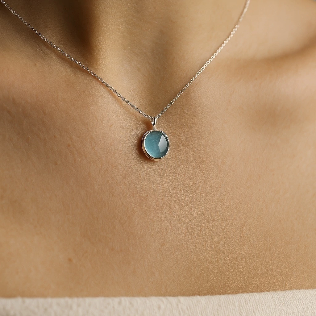 Cadena en plata esterlina 925 con dije circular de circón sintético, que refleja la luz con un brillo etéreo y sofisticado.